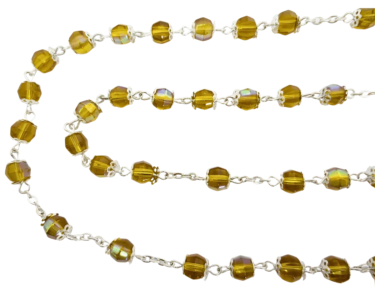 Rozenkransen zijn momenteel erg populair. Een rozenkrans bestaat uit een ketting van ronde kralen en een stalen kruis. Deze ketting heeft gele kralen.