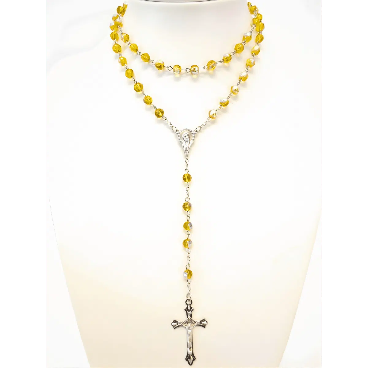 Rozenkransen zijn momenteel erg populair. Een rozenkrans bestaat uit een ketting van ronde kralen en een stalen kruis. Deze ketting heeft gele kralen.