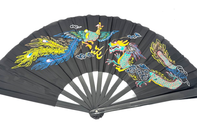 Maak een stijlvol statement met deze elegante zwarte vouw waaier met een kleurrijk draak- en feniksdesign. De opvallende print op de zwarte achtergrond symboliseert harmonie, kracht en geluk en maakt deze waaier tot een bijzonder en decoratief accessoire.