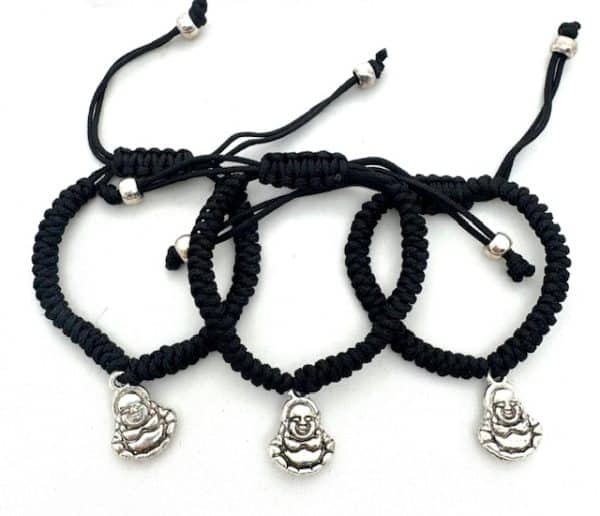 Deze armbanden zijn modieus of ter bescherming. Ze zijn gemaakt van gevlochten koorden en voorzien van een bedel met een lachende Boeddha. De koordjes zijn verstelbaar door eraan te trekken en zijn verkrijgbaar in één maat.