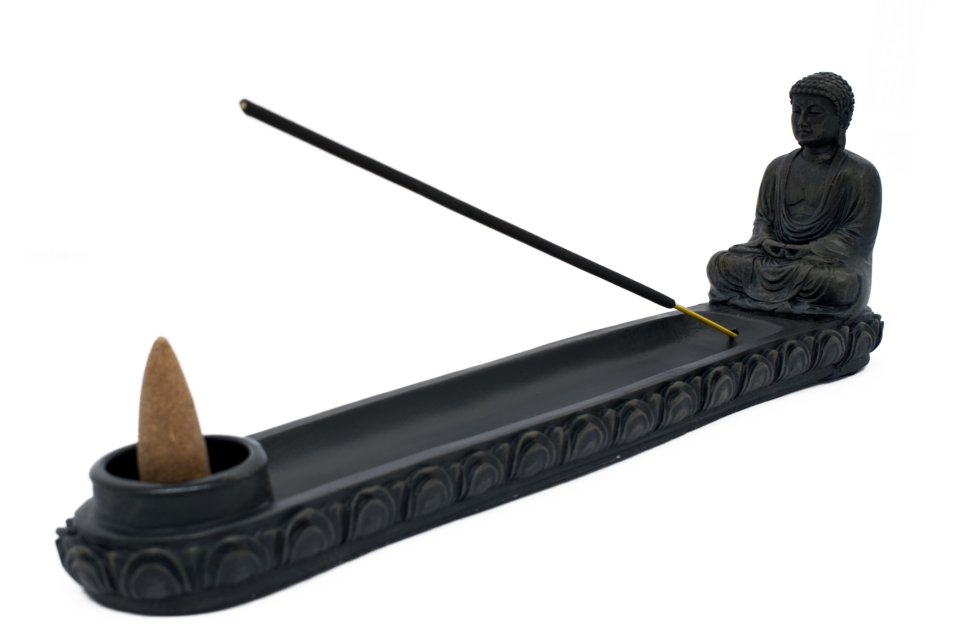 Groothandel – Zwarte Zittende Japanse Boeddha Wierookhouder voor Stokjes & Kegels