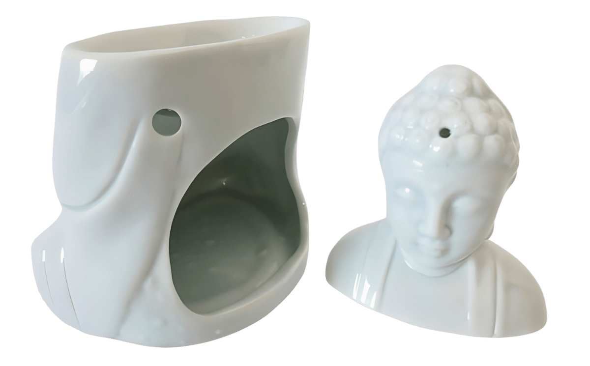 Keramische oliebrander in de vorm van een zittende meditatie Boeddha, afgewerkt met een glanzend witte glazuur.