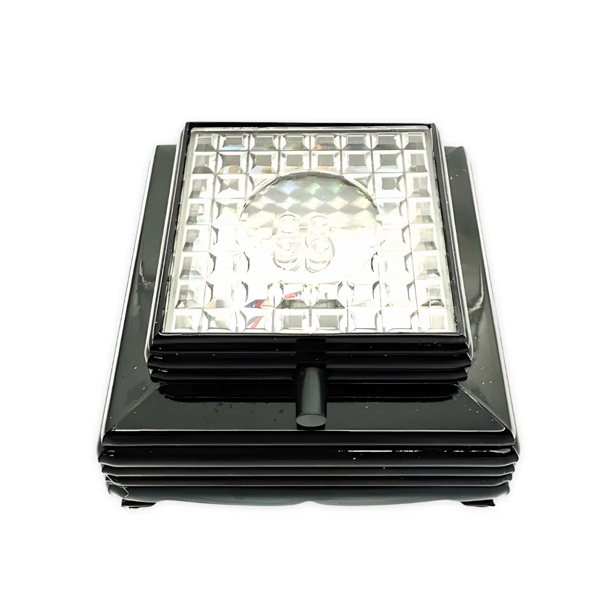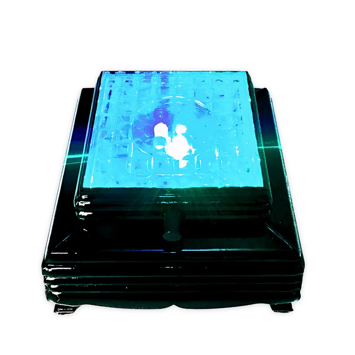 Compact, vierkant display met een Zwart gekleurd, gelaagde basis en een transparante, geprofileerde bovenplaat. De voet werkt op batterijen en heeft 3 × AA-batterijen nodig (niet inbegrepen). Een centraal licht schijnt omhoog door het oppervlak en laat kristallen, glazen decoraties of kleine beelden die erop staan extra opvallen in een vitrinekast, winkelpresentatie of interieur.