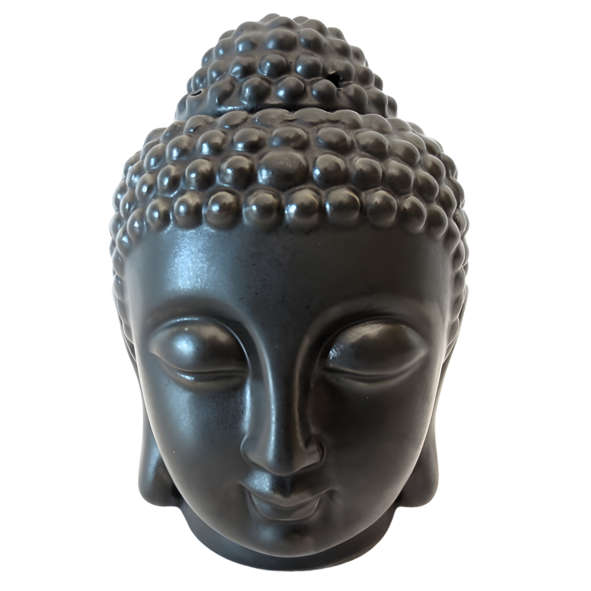 Zwarte keramische oliebrander in de vorm van een Boeddha hoofd met een matte afwerking. De brander bestaat uit een holle basis met een opening aan de achterkant voor een theelichtje en een afneembare bovenkant met kleine gaatjes. In de uitsparing aan de binnenkant kan geurolie of waxmelt worden verwarmd, terwijl het kaarslicht zacht door de openingen schijnt.